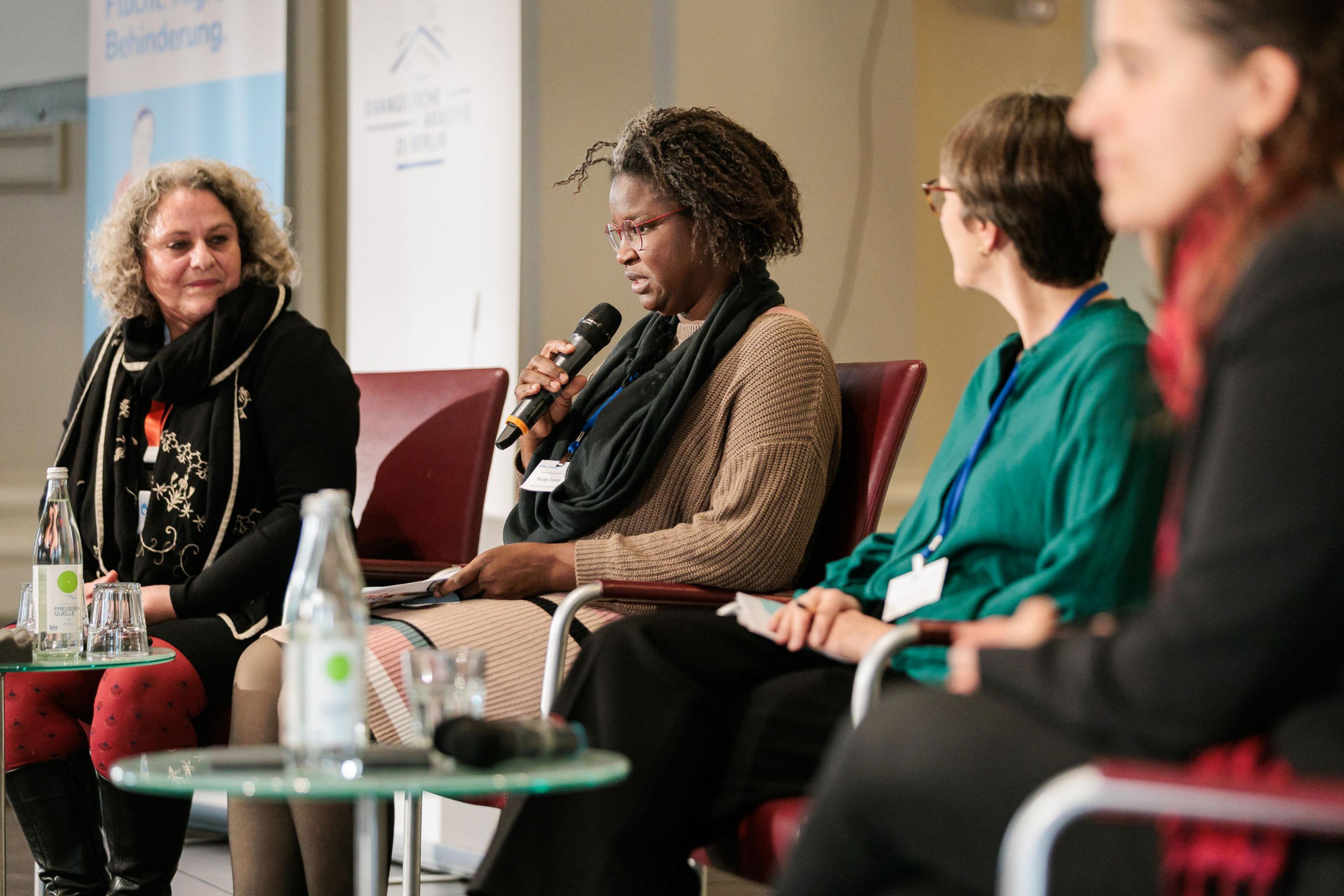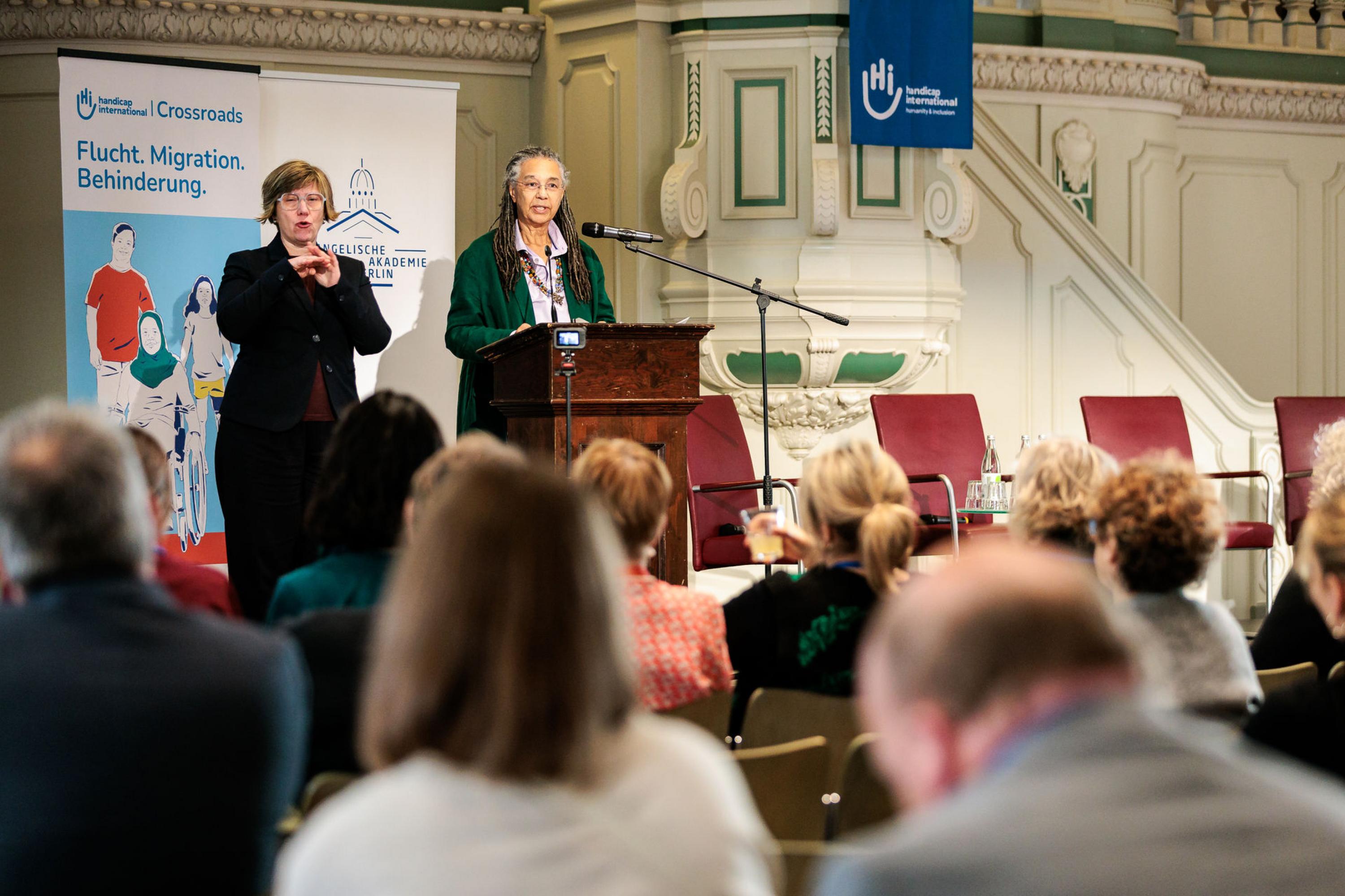 Eröffnet wurde die Veranstaltung von Dr. Inez Kipfer-Didavi, Geschäftsführerin von Handicap International Deutschland und Dr. Susanne Schwalgin, Projektleiterin von Crossroads. Den Auftakt setzte Judy Gummich, die in ihrer Keynote eindrucksvoll die Verflechtung von Rassismus und Ableismus insbesondere mit Blick auf Elternschaft und Flucht beleuchtete: „Rassismus und Ableismus sind keine getrennten Phänomene, sie bedingen sich gegenseitig.“